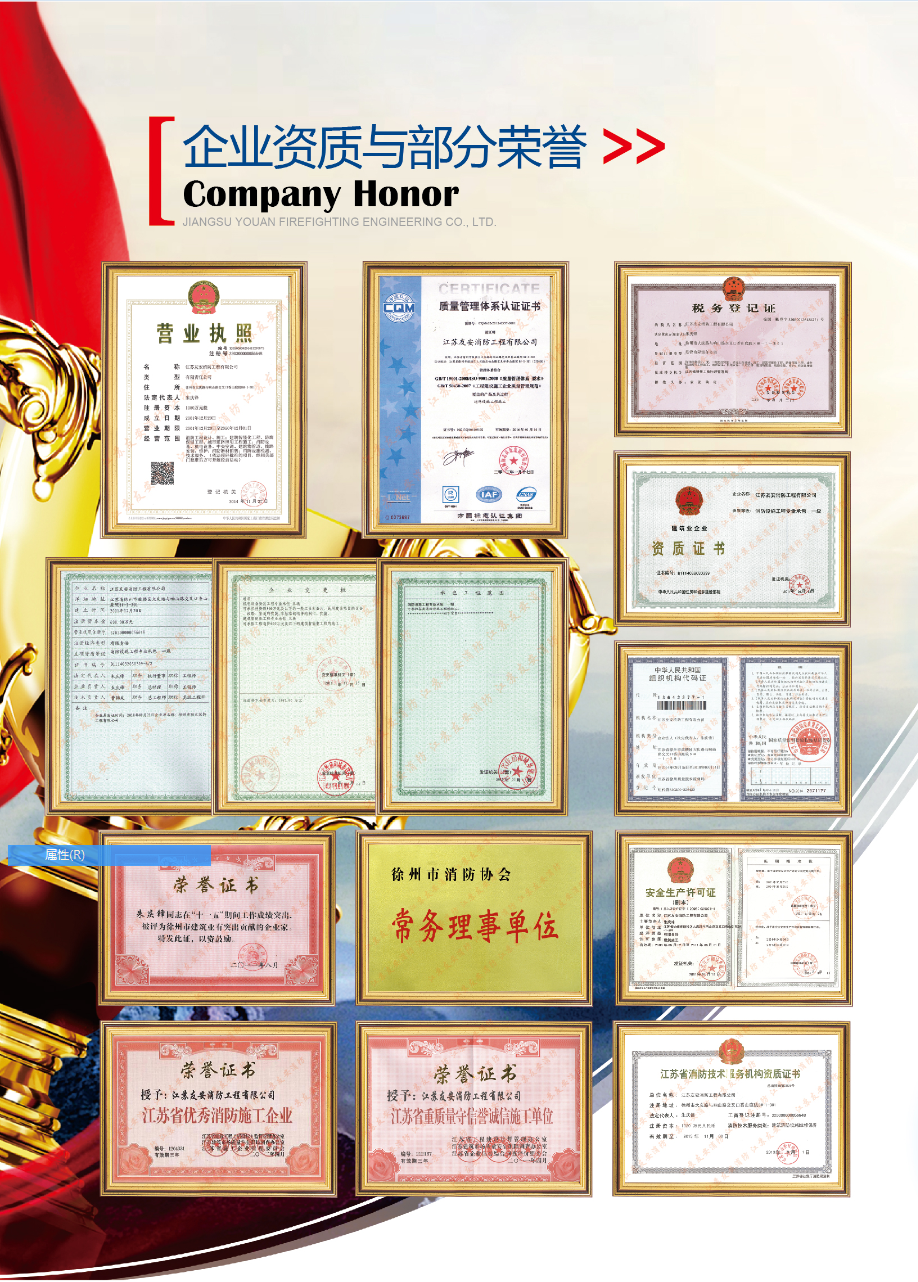 本公司是徐州市较早从事消防工程施工的企业、是支技术过硬的队伍,公司领导十分重视消防工程安装质量和安全工作,公司始终坚持以质量求生存、以信誉求发展的方针,建立完善了质量保证体系,强化消防工程施工中各个环节的工艺质量控制、建立“用户质量回访制度”做到组织严密、精心施工。多年来消防工程施工合格率达到100%,得到了消防部门、建设部门和有关领导的好评,并真实兑现了“干一个工程、树一座丰碑、交一方朋友”的承诺。近年来被江苏省建筑业主管部门授予《重质量 保安全 守信誉》AAA级优秀施工企业;消防理事单位;08年被市建设局、消防支队、消防协会认定为优秀的专业消防施工企业,并予以通报表扬。